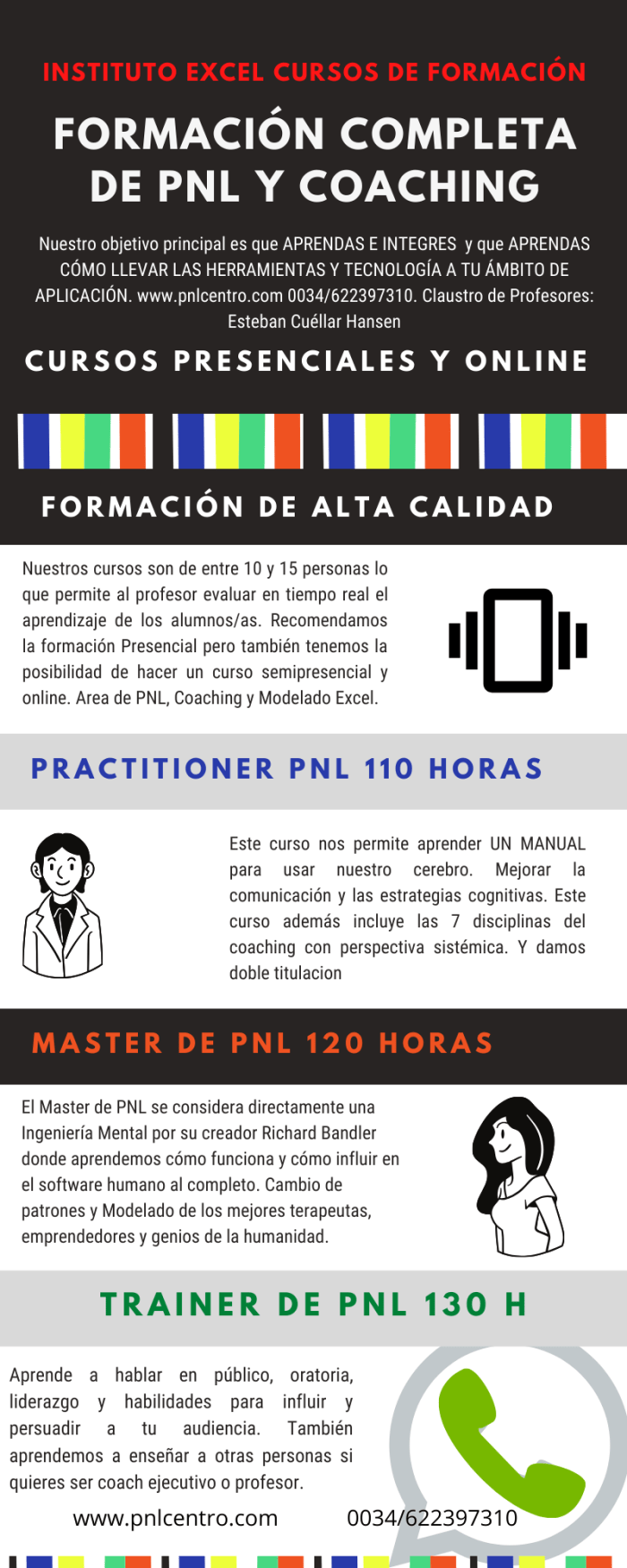Próxima Formación Completa de Programación Neurolingüística intensivo de verano 2023 con Esteban Cuéllar Hansen y el Instituto Excel Coaching. Inscripciones abiertas para personas que quieran formarse en verano. Matrícula anticipada para reservar plaza a partir de Marzo.