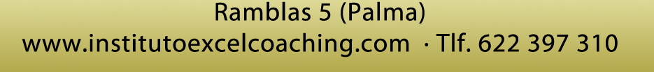 En Mallorca y en Barcelona. Sábados de 10 a 22h. Empezamos la cuarta semana de septiembre en Barcelona y la segunda de Octubre hasta Junio 2015 en Palma de Mallorca. Certificado por el Instituto Excel y PNLCentro y avalado por la AEPNL. Requisisto mínimo haber realizado el Practitioner de PNL. Doble Certificación ahora podrás elegir también un certificado emitido por Excel (coaching corporativo, coaching deportivo o terapia con pnl) así como en el curso se prestará atención al aprendizaje del alumno en relación al tipo de certificado de aplicación que elija en la entrevista inicial y curricular para la planificación del curso. Cita previa. Precio del curso 1600 euros.